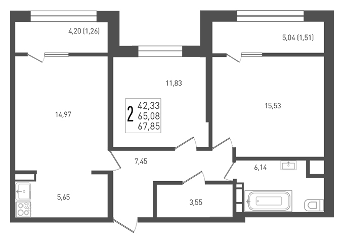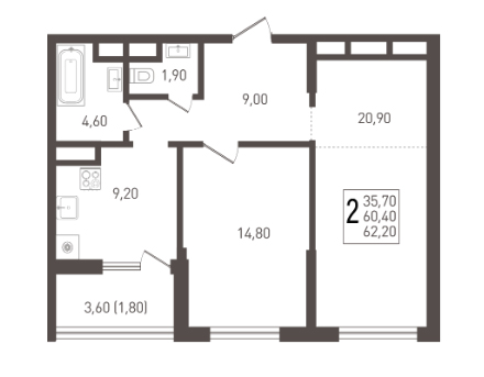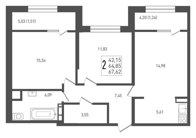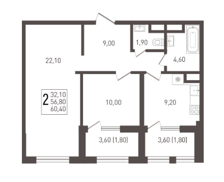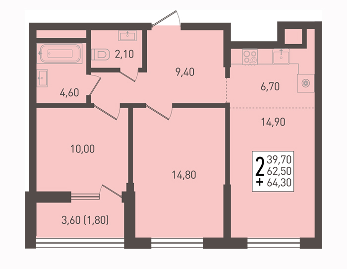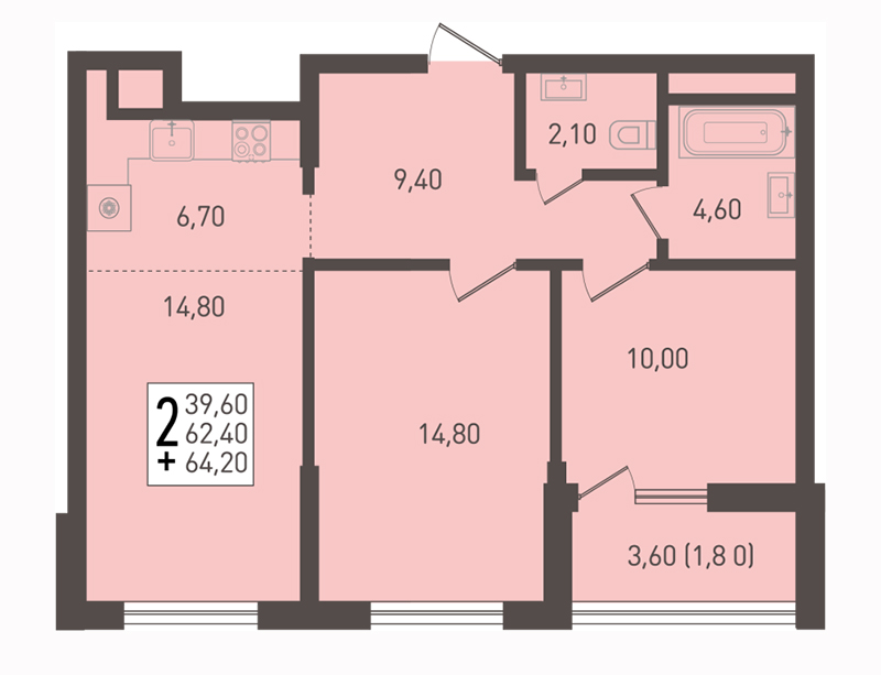 | 2 | 64.2 / 39.6 м² | от 8 179 080 руб. (127 400 руб./м²) | Планировка | |