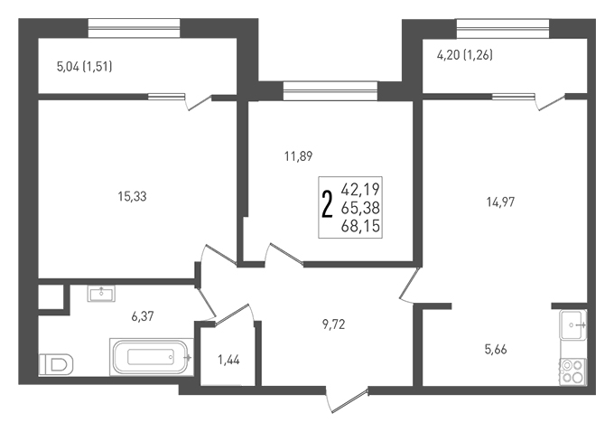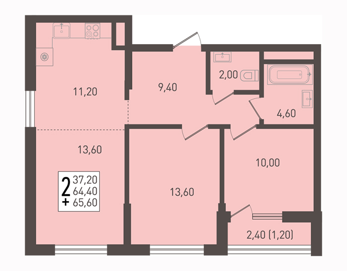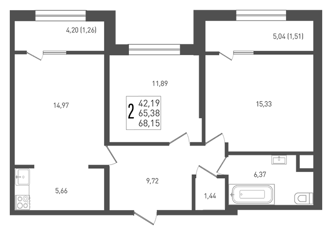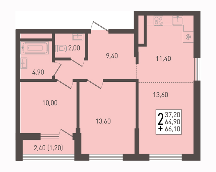 | 2 | 66.1 / 37.2 м² | от 8 421 140 руб. (127 400 руб./м²) | Планировка | |