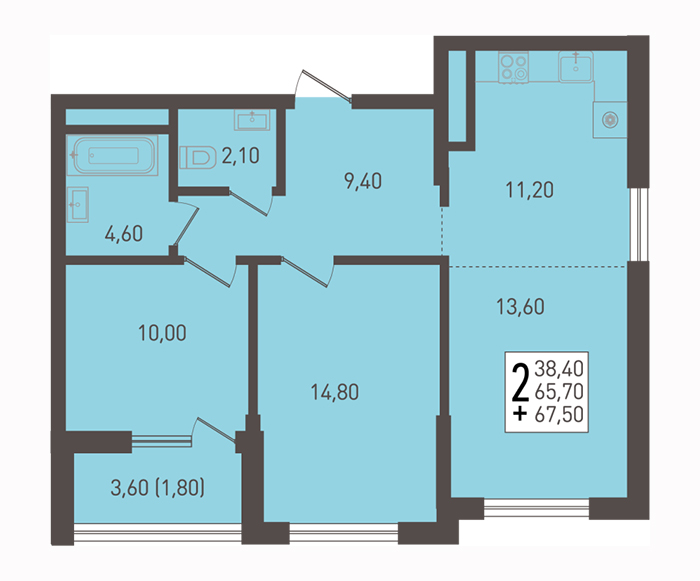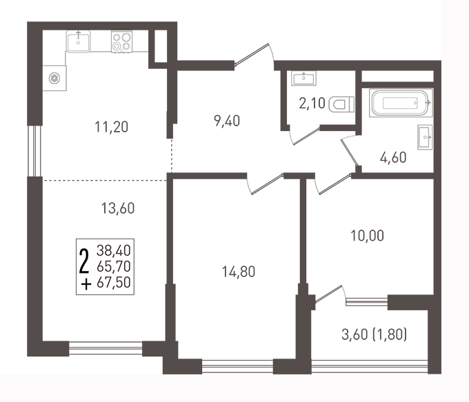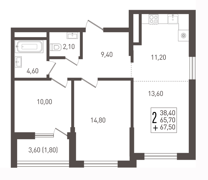 | 2 | 67.5 / 38.4 м² | от 8 599 500 руб. (127 400 руб./м²) | Планировка |