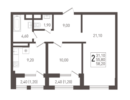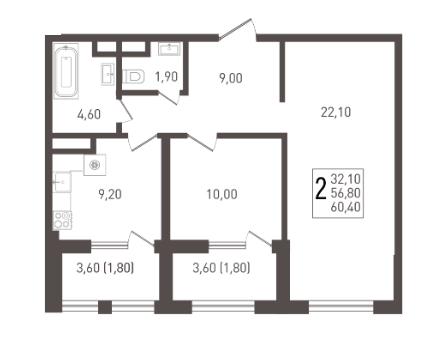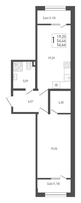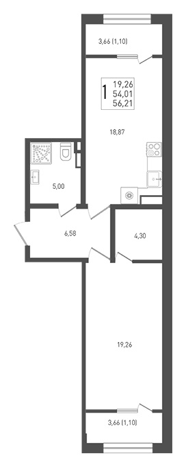 | 1 | 56.21 / 19.26 м² | от 6 801 410 руб. (121 000 руб./м²) | Планировка |