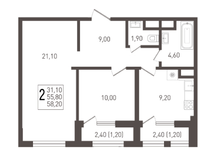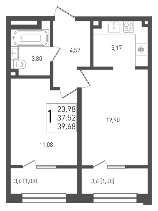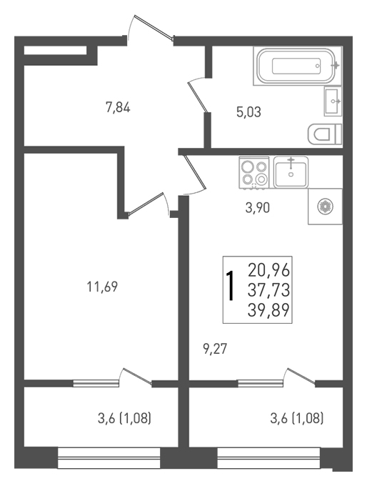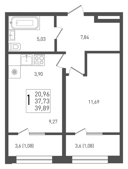 | 1 | 39.89 / 20.96 м² | от 5 520 776 руб. (138 400 руб./м²) | Планировка | |