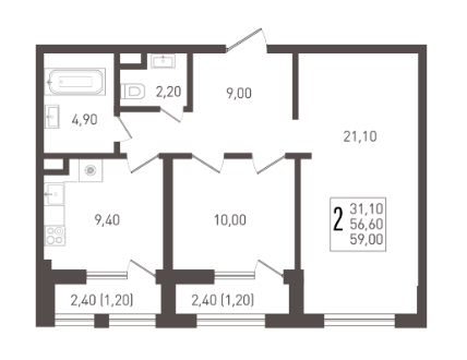 | 2 | 59.0 / 31.1 м² | от 7 516 600 руб. (127 400 руб./м²) | Планировка | |