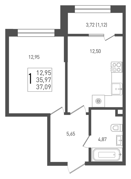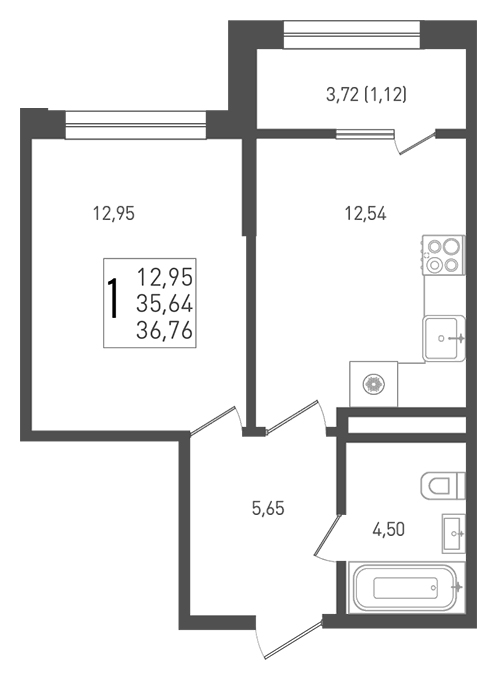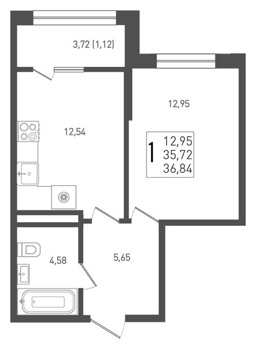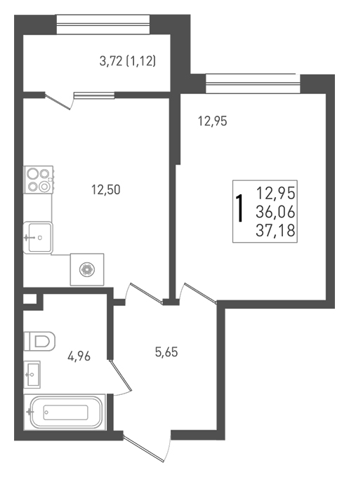 | 1 | 36.76 / 12.95 м² | от 5 087 584 руб. (138 400 руб./м²) | Планировка | |