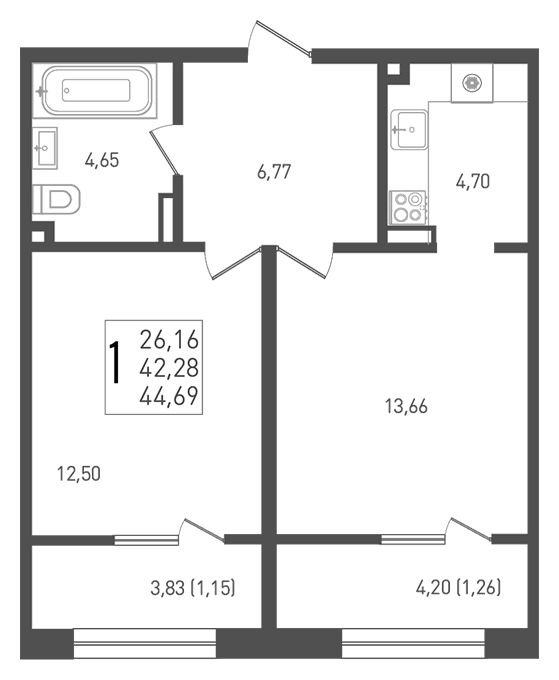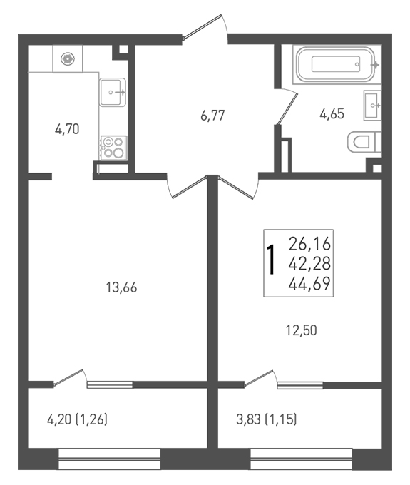 | 1 | 44.69 / 26.16 м² | от 5 407 490 руб. (121 000 руб./м²) | Планировка | |