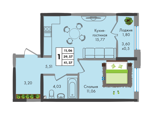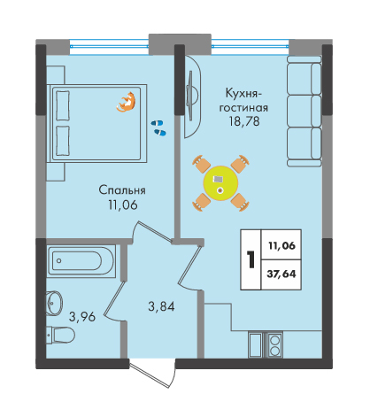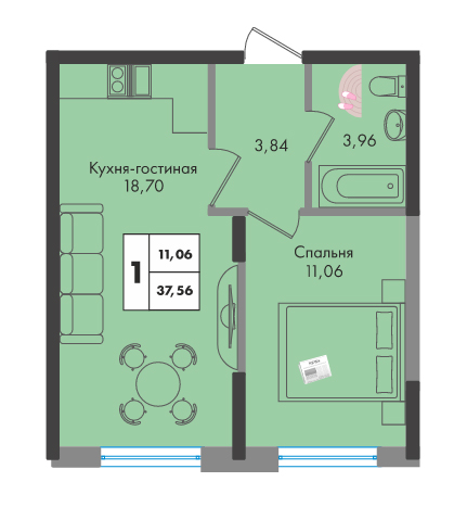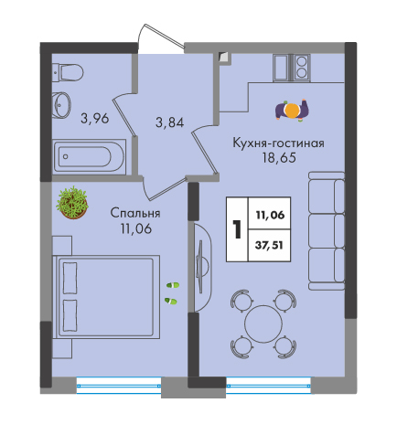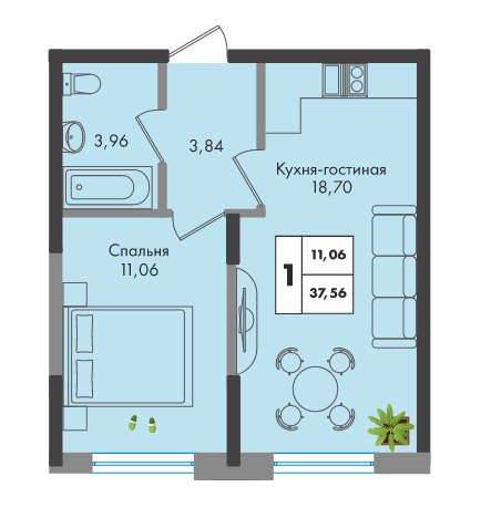 1 37.56 / 11.06 м² от 5 333 520 руб. (142 000 руб./м²) Планировка