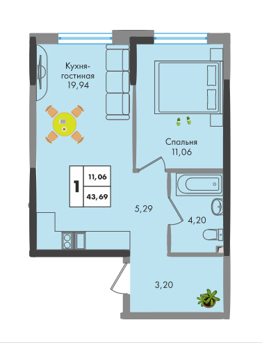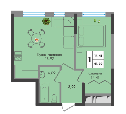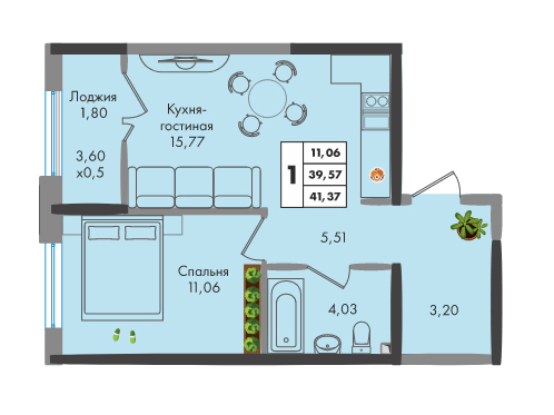 1 41.39 / 11.06 м² от 5 877 380 руб. (142 000 руб./м²) Планировка