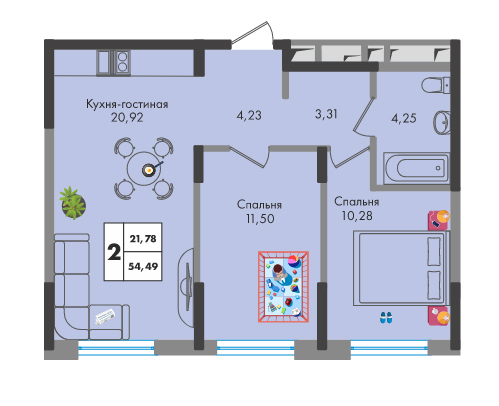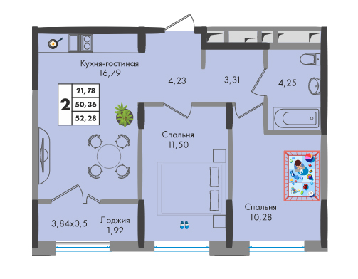 2 52.28 / 21.78 м² от 7 319 200 руб. (140 000 руб./м²) Планировка