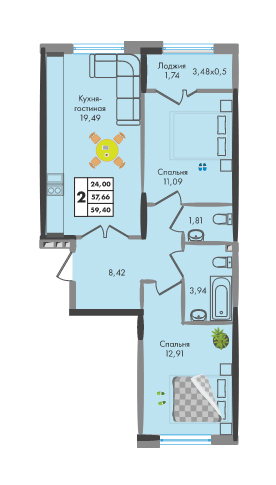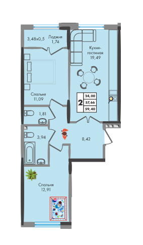 2 59.4 / 24 м² от 8 316 000 руб. (140 000 руб./м²) Планировка