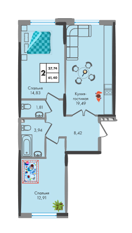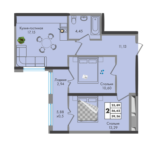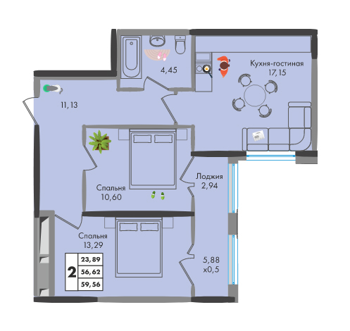 2 59.56 / 23.89 м² от 8 695 760 руб. (146 000 руб./м²) Планировка