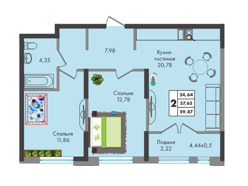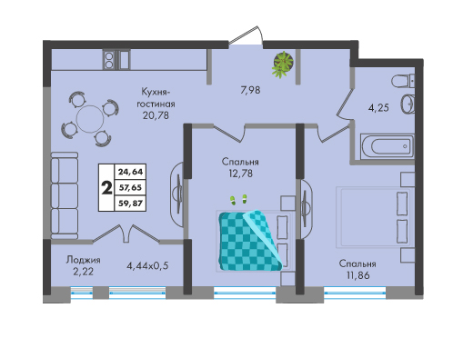 2 59.87 / 24.64 м² от 8 741 020 руб. (146 000 руб./м²) Планировка