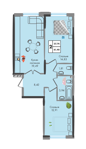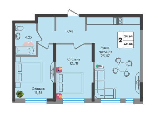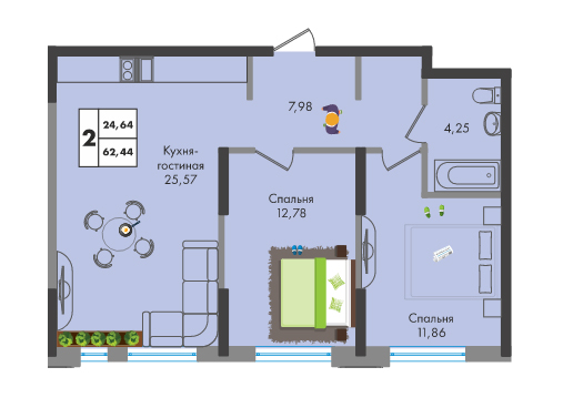 2 62.44 / 24.64 м² от 8 616 720 руб. (138 000 руб./м²) Планировка