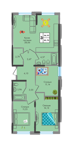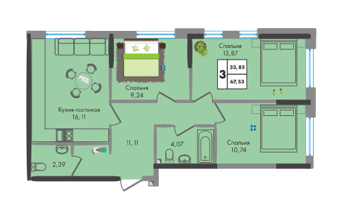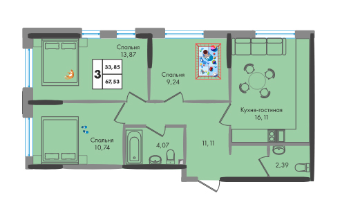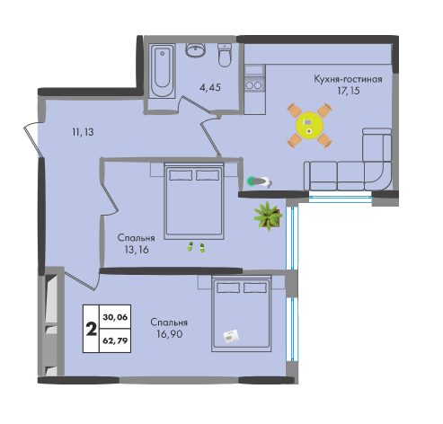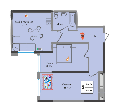 2 62.79 / 30.06 м² от 9 041 760 руб. (144 000 руб./м²) Планировка