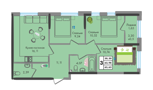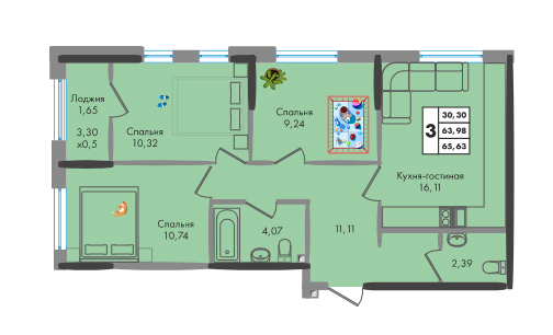 2 65.63 / 30.3 м² от 9 253 830 руб. (141 000 руб./м²) Планировка