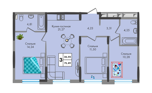 2 59.4 / 24 м² от 8 672 400 руб. (146 000 руб./м²) Планировка
