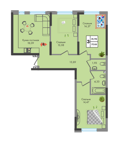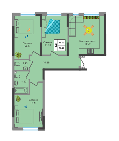 3 77.03 / 41.92 м² от 10 630 140 руб. (138 000 руб./м²) Планировка
