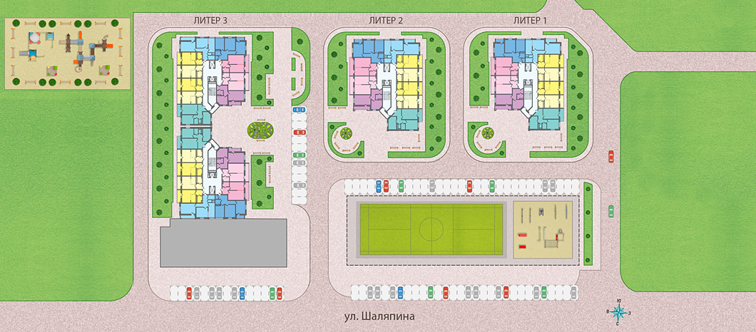 Рядом с ЖК будут просторные парковочные места для гостей. Жильцы смогут оставлять свои автомобили в специальных зданиях. На крыше этих объектов оборудуют спортивные стадионы, где можно поиграть в футбол или волейбол. Дети смогут развлекаться на игровой площадке с безопасным покрытием, где установят песочница, качели, горки и другое оборудование. Площадка расположится на видном месте, вблизи зоны отдыха.